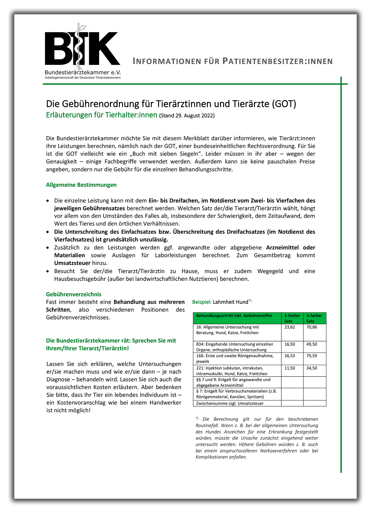 Bitte bedenken sie, dass für eine Notfallbehandlung ihres Tieres deutlich höhere Gebühren als während den normalen Sprechstunden anfallen. Die Gebührenordnung schreibt zwingend die Abrechnung einer Notdienstpauschale von 50€ und zusätzlich des 2-4fachen Gebührensatzes vor.